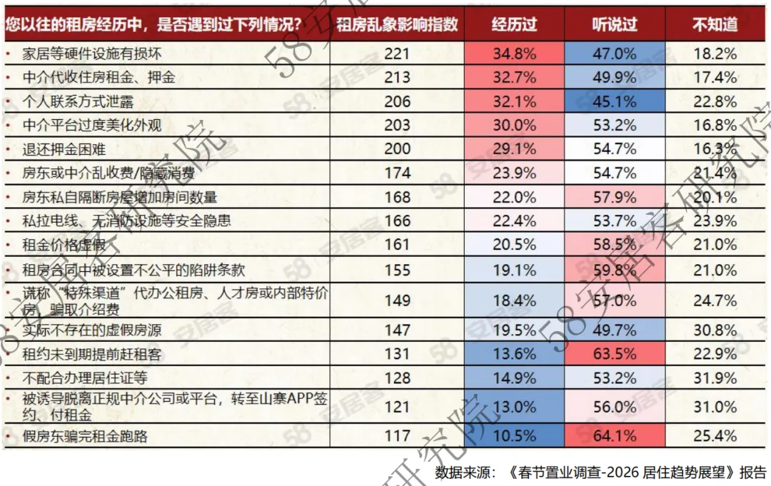 租房市场乱象覆盖范围较广,其中“信息不实”与“权益受损”是最突出的痛点。在信息不实类问题中,中介过度美化外观(53.2%)、租金价格虚假(58.5%)、假房东骗租金跑路(64.1%)等现象中“听说占比”均超50%,严重误导租房决策。针对此类问题,多地已建立住房租赁交易服务平台,要求房源信息核验后上线,通过“房源码”“一房一码”等技术手段,从源头遏制虚假信息。