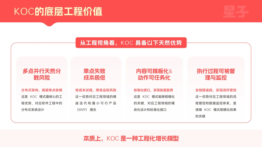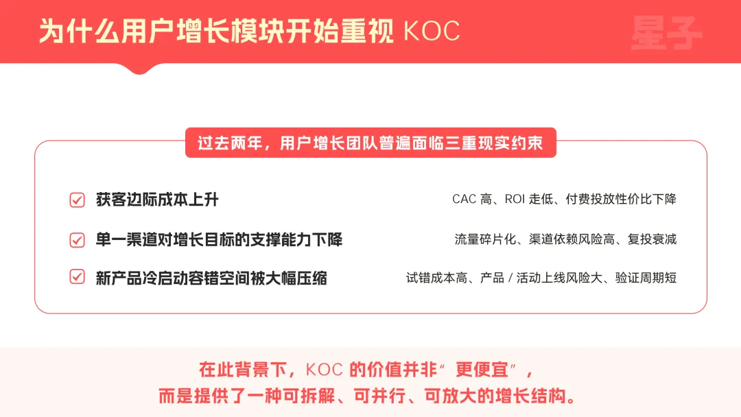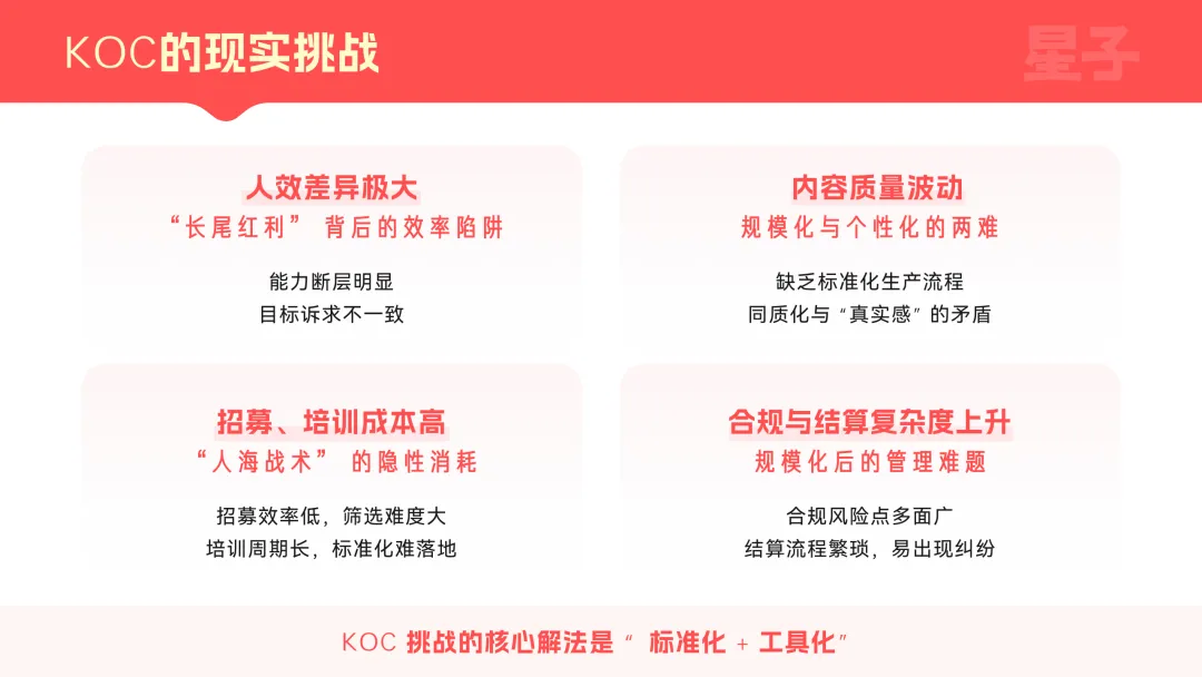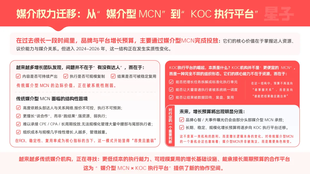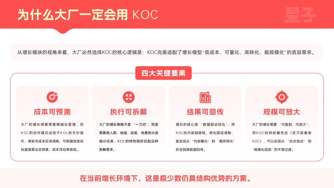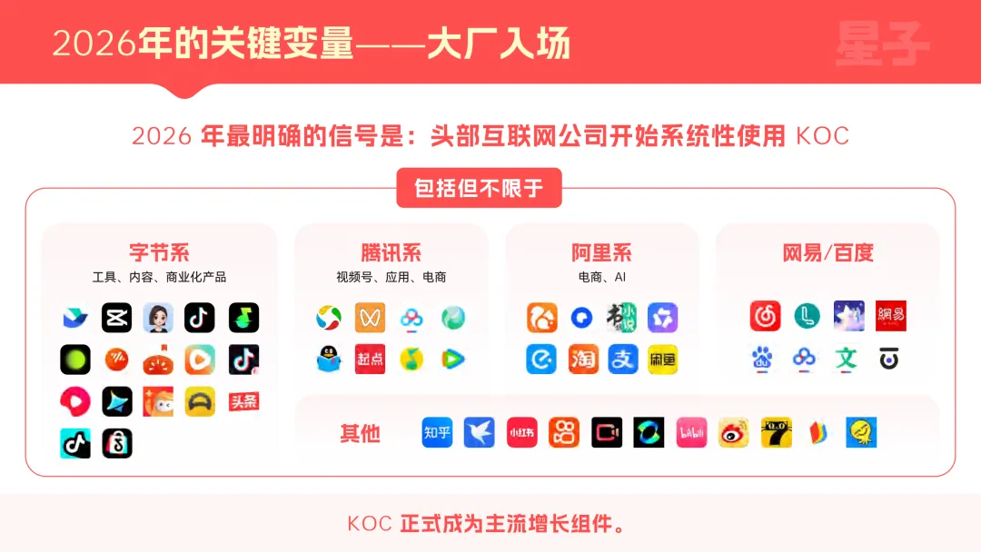 核心是存量竞争下,用户增长团队遭遇了获客边际成本上升、单一渠道支撑力下降、新产品冷启动容错空间压缩的三重约束。而KOC刚好能提供可拆解、可并行、可放大的增长结构,解决KOL模式单点依赖、不可复用、效果波动大的结构性问题,契合当前全域分销时代的行业需求。加上它能满足企业长期稳定承接预算、系统性复用、纳入组织管理的核心诉求,完美适配大厂“低成本、可量化、高转化、能规模化”的底层增长逻辑,成为企业突破增长瓶颈的必然选择,这也是200亿可量化投放预算持续向其倾斜的关键原因。