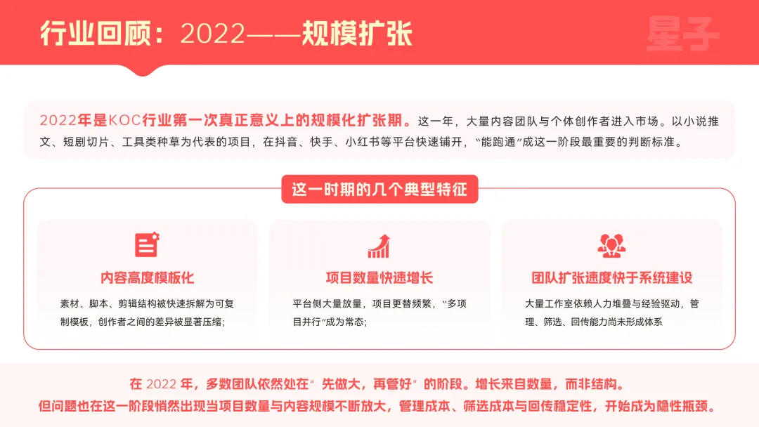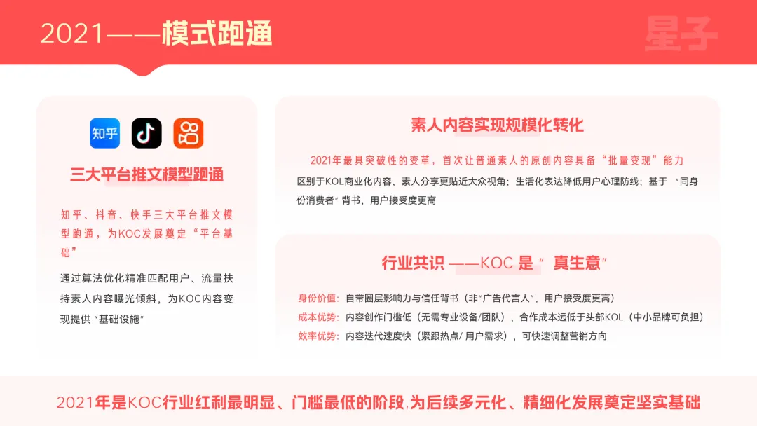 2026年KOC行业正式步入规模扩张与效率挤压的关键阶段,早已跳出“可选打法”的范畴,成为企业增长的核心基础设施。行业核心价值不再局限于单一内容结果,而是转向更具长远价值的结构能力,据星子文化发布的《2026KOC行业发展白皮书》显示,今年可量化投放预算预计达200亿元,配套CPE、CPA等四类标准化计价方式。凭借分布式风险分散、低成本试错、标准化复用的工程化优势,KOC成功破解KOL模式单点依赖、不可复用的痛点,精准适配大厂“低成本、可量化、高转化、能规模化”的增长需求,人机共生的效率革命已然开启。与此同时,行业也面临人效差异、合规管控等现实挑战,门槛从资源驱动转向系统能力驱动,大厂入局成为影响行业格局的关键变量,星子文化等平台作为基础设施构建者,正以全链路服务为行业发展提供技术支撑。