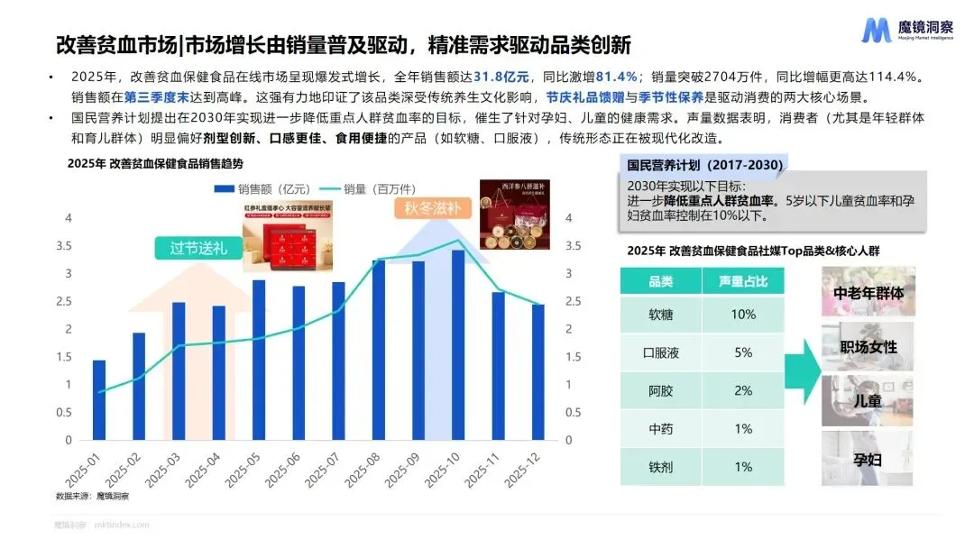改善贫血保健食品销售额达31.8亿元,同比激增81.4%,销量同比增幅更高达114.4%。核心消费人群向年轻职场女性、备孕及产后女性聚焦,需求从单纯补铁转向“补血+美容养颜+体重管理+肠胃友好”的多元协同诉求,日常保养与节庆礼赠成为核心驱动场景。