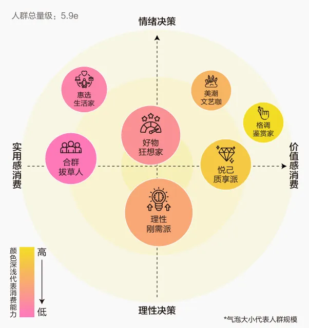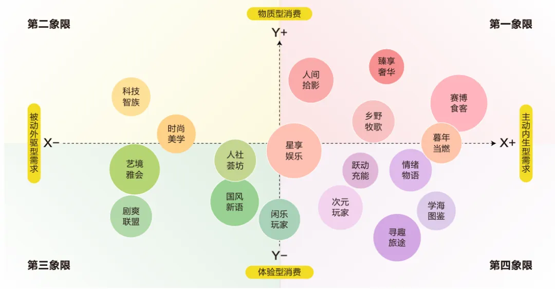 这是跳出行业壁垒,以兴趣偏好定义的广阔天地。巨量引擎基于海量用户行为,构建了 19大兴趣圈层、200+细分人群 的体系,并将其置于“需求驱动-消费类型”坐标系中。