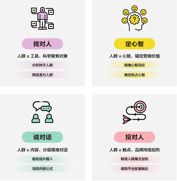 有了人群体系,如何转化为增长?报告给出了“找对人、定心智、说对话、投对人”的四步科学链路。