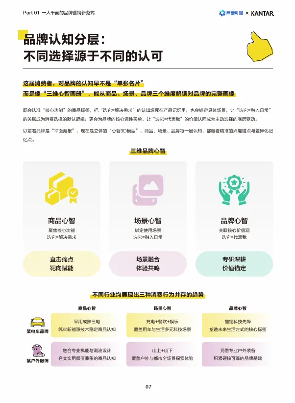 消费者对品牌的认知是立体的。他们既认准“选它=解决需求”的核心功能,也关联“选它=融入日常”的具体场景,更会为 “选它=代表我”的品牌价值买单。品牌需要在这三个维度上同时构建差异化认知。