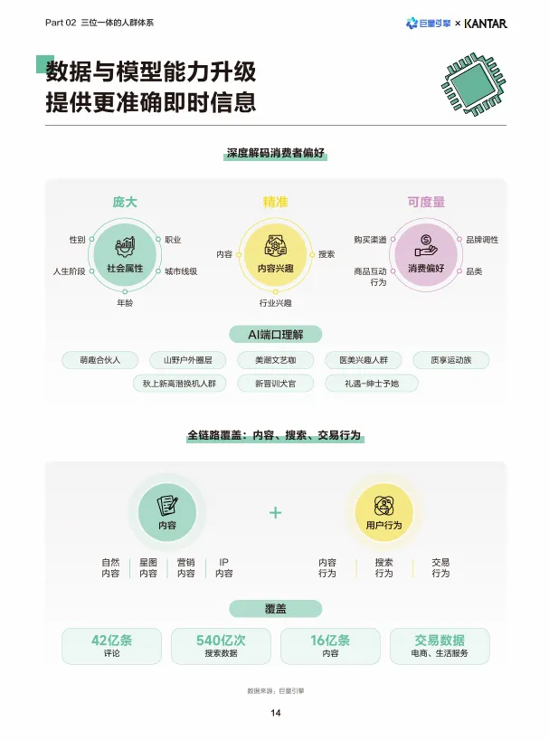 面对复杂的消费者,巨量引擎与凯度构建了“品牌自有人群-行业特色人群-兴趣圈层人群”三位一体的人群体系,穿透数据,还原鲜活个体。