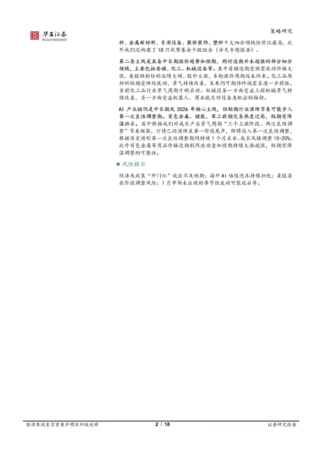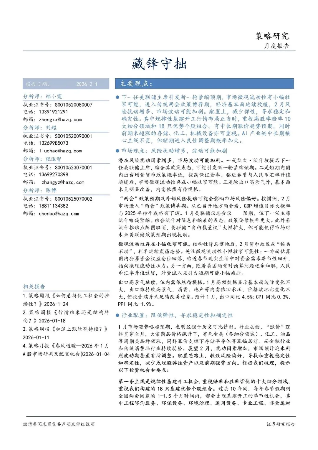 下一任美联储主席引发新一轮紧缩预期,市场微观流动性有小幅收窄可能,进入传统两会政策博弈期,经济基本面延续放缓,2 月风险扰动增多、市场波动可能加剧。配置上,减少弹性,寻求稳定和确定性。其中规律性基建开工行情布局正当时,重视高胜率赔率 10大细分领域和 18 只优势个股组合。有中长期涨价趋势预期,同时前期未超涨的存储、化工、机械设备亦可重视。AI 产业链中长期核心主线不变,但短期进入良性调整期概率加大。