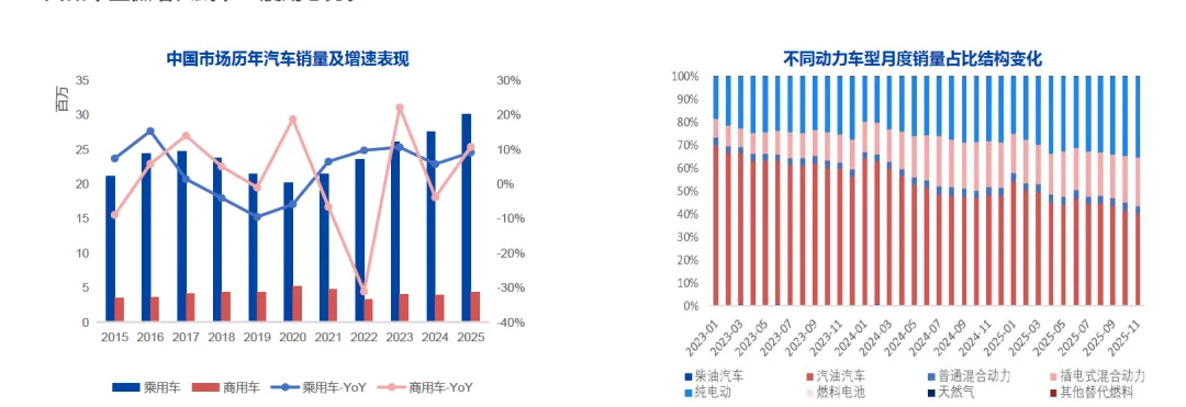 2026年汽车市场或将从“增量驱动”转向“存量博弈”,呈现微增长或窄幅震荡。2025年汽车累计销量3435万辆,同比+9.3%,乘用车销量3,006万辆(+9.1%)销量429万辆与商用车(+10.7%)均实现稳健增长。新能源乘用车1-11月销1,391万辆(+29.3%),累计渗透率达51.1%。其中纯电车型增速(+39.4%)高于插混(+15.1%),纯电渗透率达32.1%。2025年新能源渗透率突破50%临界点,新能源车替代进程天花板临近。考虑新能源购置税减免退坡、以旧换新补贴力度可能减弱,2026年汽车行业或将从“增量驱动”转向“存量博弈”,头部集中度或将进一步提升,全年总销量大概率呈微增长或窄幅震荡态势。
