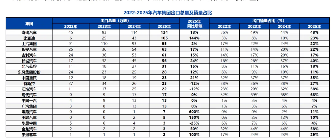 2025年汽车出口量价齐升、结构优化、前稳后高。全年国产车出口总量达710万辆,同比增长21%,较2024年增速持平,继续保持全球汽车出口第一大国地位。乘用车为出口增长的核心引擎,远超客车增速。头部集中度提升、民营车企崛起、外资车企份额收缩。行业向具备核心技术和全球化布局能力的头部企业集中。其中,自主车企表现突出,出口占比从2024年的22%提升至2025年的24%,为增长主力。合资车企出口走强,外资车企在华生产基地出口占比自2022年的38%降至2025年的27%,受全球产能调整及本土品牌竞争影响明显。区域结构重塑,墨西哥替代俄罗斯跃居第一大出口地。出口目的地以欧洲、东盟、南美为主,“一带一路”沿线国家出口占比保持较好。墨西哥(17%)、俄罗斯(15%)、阿联酋(14%)构成第一梯队,三者合计占比达46%。其中,墨西哥作为连接南北美的核心跳板,成为头部车企重要增量来源。
