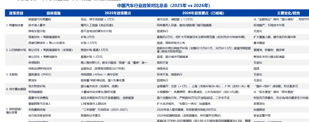 2026年新能源购置税从全额免征转为减半征收,上限1.5万元。以旧换新政策延续,但管理更加精细化。地方激励向“使用端”后移,政策导向从单纯的“买车便宜”向“用车便宜”(如充电优惠、路权倾斜)转移。随着新能源保有量快速提升,补能便利性与路权优势将接棒购车补贴,成为消费者决策的关键因子。我们认为政策端对汽车产业的扶持基调在2026年得到延续,中高端智能汽车或相对更加受益。
