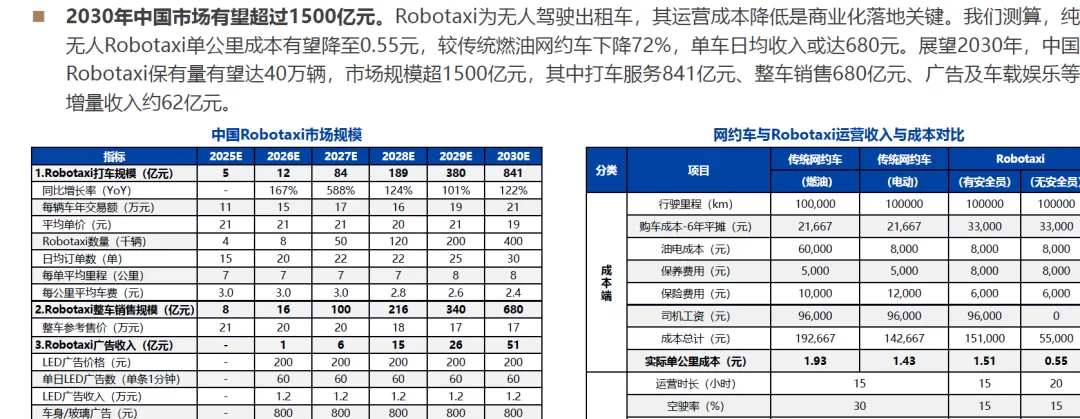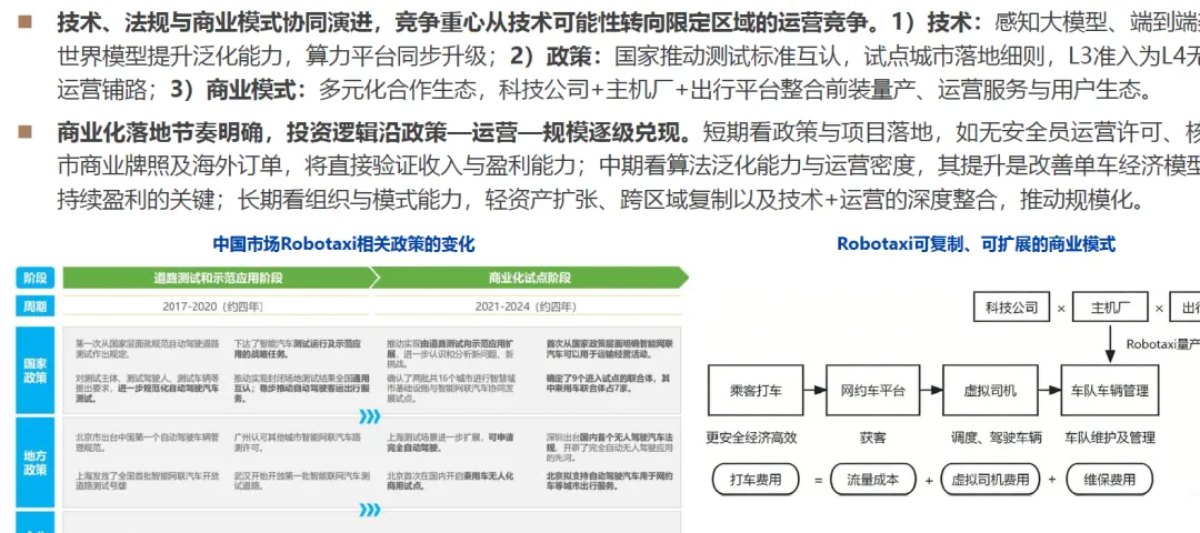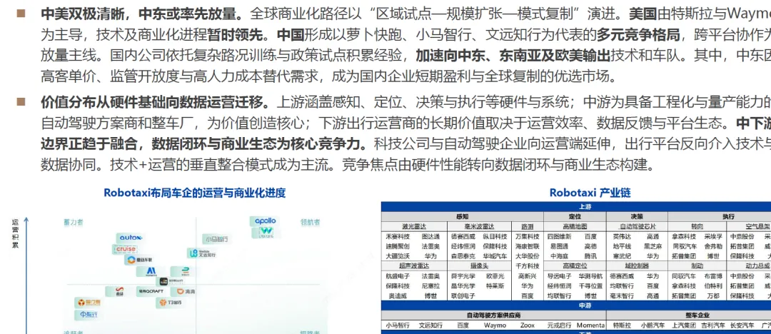 预计2026年是汽车高阶智驾技术成熟度、政策法规、用户接受度与商业模式共同突破的窗口,建议重视汽车智能化。智能化对汽车行业的改造贯穿产业全链条,核心变革体现在:1)产业逻辑重构:从电动化单一驱动转向智能化核心权重,智能化之于车企将从加分项转变为生存项,城市NOA等智驾体验成为车企突破用户心智获得认可主要途径;2)商业模式颠覆:从一次性硬件销售转变为硬件+软件+服务的持续变现,车企突破高阶智驾后将有机会形成硬件引流+软件订阅+Robotaxi运营的多元业务结构;3)竞争格局分化:从分散混战转或变为头部集中、强者恒强的淘汰赛,具有智能化战略定力和系统性降本能力的头部车企与竞争对手的智能化差距将拉大;4)产品定义革新:从“交通工具”到“AI移动终端”,电动化是半成品,智能化才完成对传统百年燃油车的终极颠覆。整车:2026年高阶自动驾驶或迈向规模化商用,具备大模型、算法、芯片及数据闭环等全栈自研能力的头部车企,将率先实现技术落地与体验领先,显著拉大与竞争对手的差距,并最直接受益于智能化带来的产品溢价与估值提升,推动行业加速向头部集中。关注[小鹏汽车(9868.HK)、小米集团(1810.HK)、理想汽车-W(2015.HK)、零跑汽车(9863.HK)、长安汽车(000625.SZ)、长城汽车(601633.SH)、上汽集团(600104.SH)】零部件:2026年智能化加速发展趋势下,看好具备Tier0.5能力的自主零部件企业从单一模块供应向全栈系统集成方案供应转变。算力芯片、智能底盘等赛道有望涌现全球级系统供应商,实现从产业链参与者到定义者的跃迁,支撑中国智能汽车崛起。关注[保隆科技(603197.SH)、地平线机器人-W(9660.HK)】。营运服务:Robotaxi有望随高阶自动驾驶技术成熟加速商业化,在政策支持与模式创新推动下,未来1-2年从技术验证迈向规模化盈利,成为城市出行基础设施。看好具备领先高阶智驾方案的车企及系统级解决方案商率先受益,开辟新增长曲线。关注[曹操出行(2643.HK)、小马智行(2026.HK)、文远知行(0800.HK)】