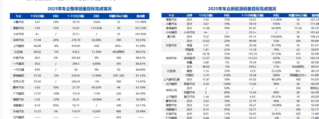 根据2025年1-11月累计数据,16家主流车企平均目标完成率约80%。其中,零跑、小米、小鹏提前达标,比亚迪、吉利等头部企业发挥规模优势,有望完成全年指标。同时,行业分化加剧,部分车企年度目标完成率明显不足。当前车企的主要增长贡献均来自新能源车,加速提升新能源渗透率,将是2026年稳固市场份额与激活产能效率的核心驱动力。
