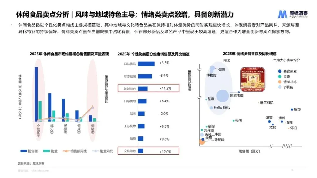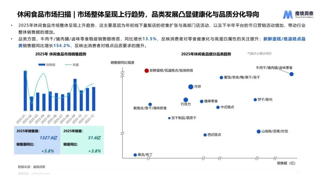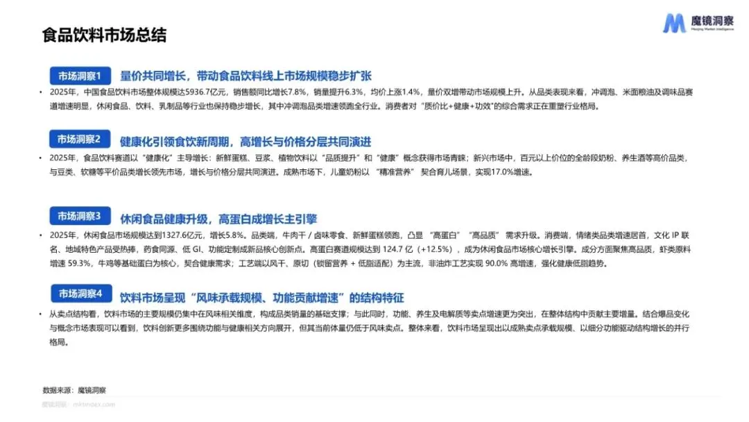 《2025年度消费新潜力白皮书》由魔镜洞察发布,涵盖食品饮料、大健康、家用电器、美妆护肤、3C数码、母婴六大消费领域。2025年中国食品饮料市场整体规模达5936.7亿元,销售额同比增长7.8%,销量提升6.3%,均价上涨1.4%,呈现量价齐升的健康增长态势。其中休闲食品规模最大,达到1327.6亿元。冲调泡、米面粮油及调味品赛道增速明显,冲调泡品类增速领跑全行业。健康化成为食品饮料赛道的主导增长逻辑。新鲜蛋糕、豆浆、植物饮料以"品质提升"和"健康"概念获得市场青睐。儿童奶粉以"精准营养"契合育儿场景,实现17.0%的增速。市场呈现明显的价格分层特征,百元以上价位的全龄段奶粉、养生酒等高价品类,与豆类、软糖等平价品类并行发展,增长与价格分层共同演进。休闲食品市场规模达到1327.6亿元,增长5.8%。牛肉干、卤味零食、新鲜蛋糕领跑品类增长,凸显"高蛋白""高品质"需求升级。高蛋白赛道规模达到124.7亿元,同比增长12.5%,成为核心增长引擎。虾类原料增速高达59.3%,牛鸡等基础蛋白为核心,契合健康需求。工艺端以风干、原切为主流,非油炸工艺实现90.0%高增速,强化健康低脂趋势。休闲食品市场竞争格局呈现高度分散、品牌集中度偏低特征。TOP10品牌销售额大幅下滑,市场份额持续被新兴中小品牌分流。增速前十的品牌,其热销单品核心卖点均精准覆盖"解馋"这一核心情绪满足需求;而牛肉干、牛腱肉等高蛋白单品的持续热销,反映出消费者在追求味觉与情绪愉悦的同时,正逐步增加对营养性的考量。饮料市场呈现"风味承载规模、功能贡献增速"的结构特征。风味成分仍是基本盘,但功能、养生及电解质等卖点增速更为突出,在整体结构中贡献主要增量。草本成分受到消费者追捧,桦树汁、黄芪、金银花、羽衣甘蓝等的销售额都表现出明显增长。功效维度中,肠胃调理、滋补滋润、美容养颜增速显著,表明消费者对具备明确健康功能指向的产品接受度持续提升。饮料爆品从"基础减糖"向"功能+天然"进阶。2023年爆品如乌龙茶、茉莉花茶、无糖气泡水等,主打无糖低脂等健康标签;2024年红豆薏米水(祛湿)以及2025年的白桦树汁(调节代谢)、高纤维饮(饱腹)、金银花柚子汁(下火)的走红,体现了市场健康需求的升级。核心是健康需求从"被动规避不健康成分"转向"主动获取营养价值"。2025年大健康市场稳健增长,整体销售额超3000亿,达到3043.8亿元,同比增长15.8%,销量约29.2亿件,同比增长19.0%。保健食品类规模最大,销售额达到1244.8亿元,占据大健康市场40.9%,同比增长19.9%。增强免疫力市场以超198.9亿规模领跑保健食品市场,口服美容、骨骼健康市场同样领先,规模均接近170亿。改善贫血、睡眠管理、脑营养等赛道增速均高于市场平均水平,其中改善贫血市场2025年销售额同比激增81.4%,这一增长部分得益于春节礼赠场景的热度攀升与养生滋补消费风潮的兴起。改善贫血保健食品在线市场呈现爆发式增长,全年销售额达31.8亿元,同比激增81.4%;销量突破2704万件,同比增幅更高达114.4%。核心消费人群向年轻职场女性、备孕及产后女性聚焦,需求从单纯补铁转向"补血+美容养颜+体重管理+肠胃友好"的多元协同诉求。新锐品牌主导高增长,产品创新聚焦零食化剂型与有机铁成分,软糖剂型声量占比达10%。2025年中国脑营养产品市场规模同比增长50.6%,显示出强劲的增长势能。以"脑营养"为核心话题的社媒声量一年内激增303.4%,这主要源于全年龄段细分需求的集中爆发,青少年专注力、职场脑雾缓解等诉求持续升温。益智场景是最大的需求板块,核心是"提升学习力",显示出市场由学业竞争、职业发展等主动型、成长型需求主导。保健食品市场持续增长,销售额达到1244.8亿,同比增长19.9%。斯维诗、汤臣倍健两大品牌在天猫、京东两大传统平台稳定占据前五位置;抖音平台,诺特兰德凭借丰富产品线和核心爆品持续霸榜增长良好,白牌新锐养能健从2024年6月开始在抖音直播并随后实现"火箭式增长"。腰部市场展现更多增长活力,脑营养、口服美容等成为新品牌入局首选赛道。大健康市场呈现三大趋势:协同成分与功效精准化,"主效成分+协同成分"组合成为标配;人群需求全龄化,从传统聚焦孕产女性、中老年群体,向青少年、职场白领、素食者、减肥人群等拓展;消费场景与功效深度绑定,功效设计紧密贴合高频场景,如备考、加班、日常养护、术后恢复等。(注:报告内容在提供的页面中未完整展示家用电器部分的详细分析,仅显示章节标题页)从这份白皮书可以看出,2025年中国消费市场正在经历从"泛化"到"精耕"的深刻变革。无论是食品饮料还是大健康领域,消费者需求都从基础功能转向精准匹配特定场景和人群的细分需求。健康化不再是简单的概念营销,而是渗透到成分、工艺、功效、体验等全链条的系统性升级。抖音等新兴电商平台成为新品牌崛起的核心阵地,传统电商巨头天猫、京东仍保持基本盘,但增长动力明显向内容电商转移。"专家直播+千川轰炸"模式成为新锐品牌快速突围的标准打法。配方创新与场景创新成为产品开发的两大核心方向。在食品饮料领域体现为"精准营养+场景适配+情感共鸣"的多维组合;在大健康领域体现为"主效成分+协同成分"的科学复配和"备考、加班、日常养护"等高频场景的精准绑定。消费群体从传统的主流人群向全年龄段、全生命周期拓展。儿童青少
