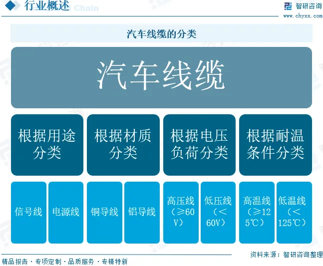 汽车线缆是指专用于汽车的电能传输、信号传递和控制的线材产品,是汽车电器的重要元件之一。根据用途的不同,汽车线缆可分为信号线和电源线;根据材质的不同,汽车线缆可分为铜导线和铝导线;根据电压的不同,汽车线缆可分为高压线和低压线;根据耐温的不同,汽车线缆可分为高温线和低温线。