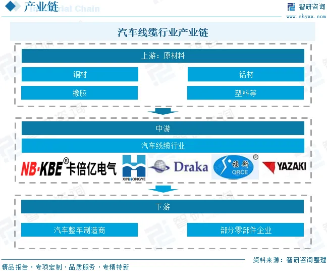 汽车线缆行业产业链上游为原材料,包括铜材、铝材、橡胶、塑料等。产业链中游为汽车线缆的生产制造环节。产业链下游为汽车整车制造商及部分零部件企业。