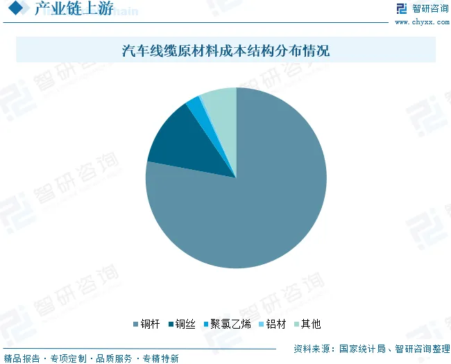 从汽车线缆的成本结构来看,原材料占据了最主要的成本构成部分,其比例高达90%以上。而在原材料成本中,铜材是最主要的成本来源,占比约90%左右。具体而言,铜材中铜杆约占原材料成本的77.95%,铜丝约占12.59%,两者共同构成了汽车线缆生产中的主要材料支出。