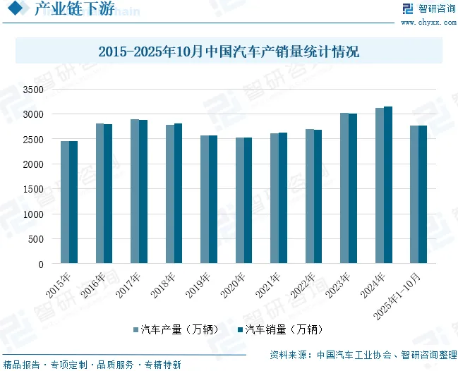 21世纪以来,随着中国加入WTO,我国经济迅速崛起,人均可支配收入不断增加,带动汽车产业快速发展,我国汽车产销量已连续多年位居全球首位。2018-2020年期间,我国汽车产销量虽受经济步入下行周期、中美贸易等多重不利因素影响,呈下滑态势,但2021年在新能源汽车产业全面发力下,我国汽车产销量恢复增长态势,2022年发展继续向好,全年实现产销量2702.1万辆、2686.4万辆,同比增速分别为3.4%和2.1%。2023年,在车企降价促销、国家促消费政策持续发力下,我国汽车产销量整体实现较大增幅,产销量分别达3016.1万辆和3009.4万辆,同比分别增长11.6%和12%,创历史新高并实现两位数增长,且连续第15年位居全球第一。2024年,在政策利好、供给丰富、价格降低以及基础设施持续改善等多重因素共同作用下,我国汽车产销累计完成3128.2万辆和3143.6万辆,同比分别增长3.7%和4.5%,产销量再创新高,继续保持在3000万辆以上规模。2025年1至10月份,汽车市场延续良好发展态势,我国汽车产销量分别完成2769.2万辆和2768.7万辆,同比增长均超过10%。汽车线缆作为汽车电气系统的关键组成部分,其市场需求与汽车产业整体发展态势紧密相关。未来,随着我国汽车产销量持续增长,尤其是新能源汽车渗透率不断提升、智能网联功能加速普及,整车电气化与电子化程度将显著提高,单车线缆用量与价值量有望进一步提升。这将直接带动汽车线缆市场规模稳步扩张,并为产业链相关企业带来持续增长动力。