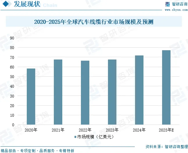 在汽车产业中,汽车线缆作为汽车电器的关键组成部分,承担着电能传输、信号传递与控制等重要功能。伴随汽车电气化、智能化水平不断提高以及新能源汽车市场的快速扩张,汽车线缆的市场需求呈现强劲增长态势。近年来全球汽车产业尤其是新能源汽车领域的快速发展,进一步推动了汽车线缆行业需求的增长,带动行业规模持续扩大。据统计,全球汽车线缆行业市场规模从2020年的58.21亿美元增长至2024年的71.74亿美元,年复合增长率为5.36%。未来,受益于全球汽车产量逐步复苏、新能源汽车渗透率提升、智能驾驶技术普及以及汽车电子化进程加速,预计2025年中国汽车线缆行业市场规模将增长至77.29亿美元。