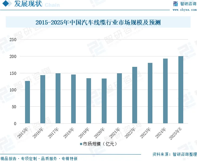 汽车线缆是汽车电器的重要元器件之一,用于汽车的电能传输、信号传递和控制,是汽车工业发展的关键组成部分。由于汽车内部是一个存在震动、摩擦、臭氧、油污、高热、寒冷和电磁辐射等各种复杂条件的工作环境,要求汽车线缆具有耐热、耐寒、耐磨、耐油和抗干扰等各种功能,以保证汽车行车安全。汽车线缆不同于其他类型线缆,是根据汽车的需求而专门设计和生产的。随着世界经济全球化的发展、新能源汽车的推广以及汽车智能化水平的提高,汽车线缆行业在汽车产业中的地位越来越重要。2017年至2020年间,我国汽车产销量受经济周期性调整、中美贸易摩擦等多重因素影响呈现下滑态势,汽车线缆行业市场规模也相应收缩,至2020年降至133.4亿元。2021年以来,随着新能源汽车爆发式增长、中国汽车品牌竞争力提升以及出口市场快速扩张,汽车产销量逐步恢复并带动线缆行业步入复苏轨道。中国汽车线缆行业市场规模从2021年的149亿元增长至2024年的193.2亿元,年复合增长率达9.05%。未来,伴随国民经济稳步发展与居民收入持续提升,汽车消费需求将进一步释放,为汽车线缆行业奠定长期增长基础。同时,汽车智能网联化的深入推进,推动单车线缆用量与附加值同步提升;而新能源汽车高压平台的快速普及,也将驱动高压线缆需求实现跨越式增长。在此趋势下,汽车线缆行业将迎来广阔发展机遇,预计2025年市场规模有望突破200亿元。