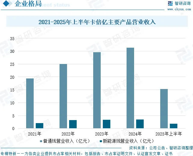 宁波卡倍亿电气技术股份有限公司主营业务为汽车线缆的研发、生产和销售。公司作为汽车供应链中的二级供应商,在取得汽车整车厂商的产品认证后,为一级供应商——汽车线束厂商提供汽车线缆配套服务。根据各大汽车整车厂商的设计要求,公司生产的产品已符合国际标准、德国标准、日本标准、美国标准、中国标准等多方面的专业汽车线缆标准,此外还能满足大部分客户的特殊技术要求。公司生产的汽车线缆产品按照应用范围可分为普通线缆、新能源线缆、数据线缆。其中,普通线缆成本较低且加工工艺相对简单,广泛应用于各类汽车上。新能源线缆主要应用于新能源汽车的电力及控制信号传输,是新能源汽车上至关重要的组成部分,主要包括:硅胶高压线、充电线缆、高压屏蔽线、XLPO高压线、PVC高压线、铝导线等产品。新能源线缆具备耐高压、耐高温、耐老化、抗断裂等特点,还需要很强的电磁屏蔽性能,其制作工艺复杂。新能源线缆产品的质量和可靠性,直接影响新能源汽车的性能和安全。汽车用数据线缆主要用于传输电子数据信息,随着汽车智能化的普及,数据线缆产品的应用将越来越广泛,可应用于显示器、摄像头、超声波雷达、毫米波雷达、以太网传输等。数据显示,2025年上半年,卡倍亿普通线营业收入为15.29亿元,同比增长5.52%;新能源线营业收入为1.91亿元,同比增长36.43%。
