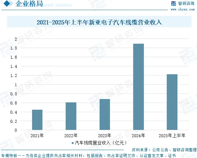 新亚电子股份有限公司主要产品包括消费电子及工业控制线材、汽车线缆、通信线缆及数据线材、新能源系列线缆及组件、其它等几大类。公司消费电子及工业控制线材,主要应用于智能家用电器、计算机、智能化办公、工业控制设备、医疗设备等领域;公司通信线缆及数据线材,其中通信线缆包括各类阻燃耐火软电缆、5G/6G光电混合缆等产品,主要应用于通信基站、机房,大型城市综合体、机场、轨道交通等领域,数据线材即高频高速铜缆连接线或高频高速数据线材,包括PCIe4.0/5.0/6.0/7.0等,主要应用于AI人工智能服务器、液冷服务器、数据中心等领域;公司新能源系列线缆及组件,包括光伏线缆和新能源系列组件,主要应用于光伏、储能、逆变器等新能源领域,以及新能源生产设备、储蓄设备以及锂电池检测设备制造等领域;汽车线缆主要应用于传统及新能源汽车周边、照明、音响、高压部件等,及新能源车辆电池周边用线等领域;其它业务,包括海外OEM加工及贸易仓储等服务、胶料销售等。据统计,2025年上半年,新亚电子汽车线缆营业收入为1.22亿元,同比增长83.21%。