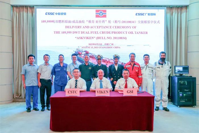 ■8月15日,广船国际联合中船贸易为VIKEN公司建造的11万吨LNG双燃料原油/成品油船2号船“ASKVIKEN”号,以及为白鲸航运公司建造的5万吨化学品/成品油船4号船“LARGO EMERALD”号签字交船,为冲刺全年任务目标再建新功。