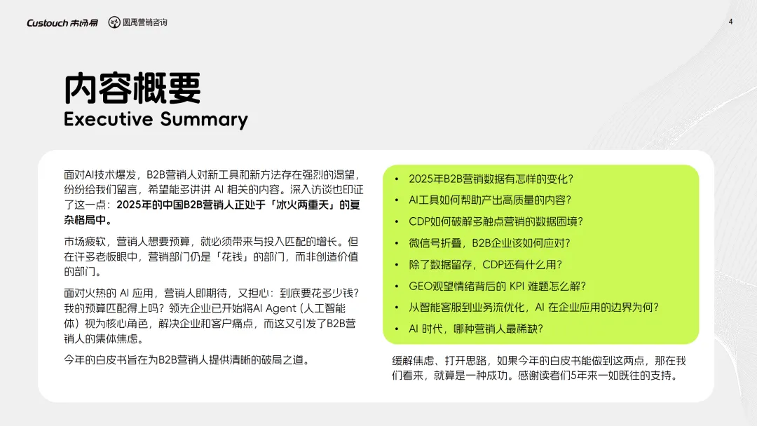 这份《2025年中国B2B市场营销现况白皮书》由市场易与圆禹营销咨询联合发布,围绕“AI驱动的成长新机遇”这一主题,系统分析了当前中国B2B市场营销的核心趋势、挑战与应对策略。以下是报告的主要内容总结: