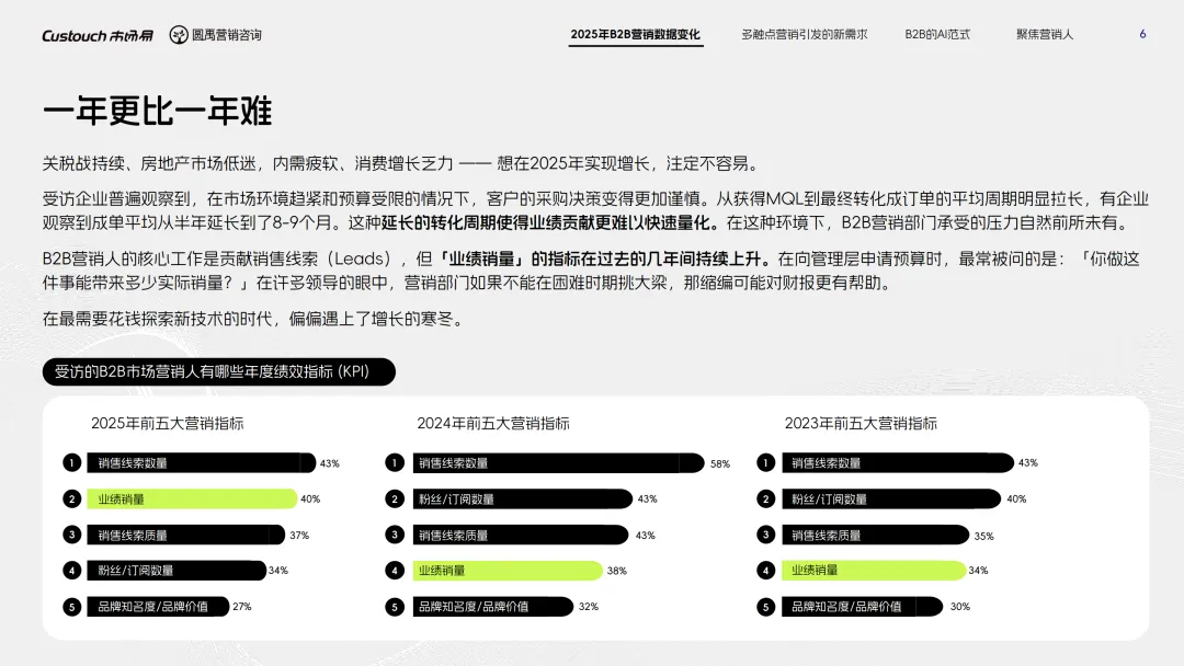 KPI重心向销售业绩倾斜:“销售线索数量”仍是首要KPI,但“业绩销量”指标占比显著上升(40%),反映营销需直接赋能销售。