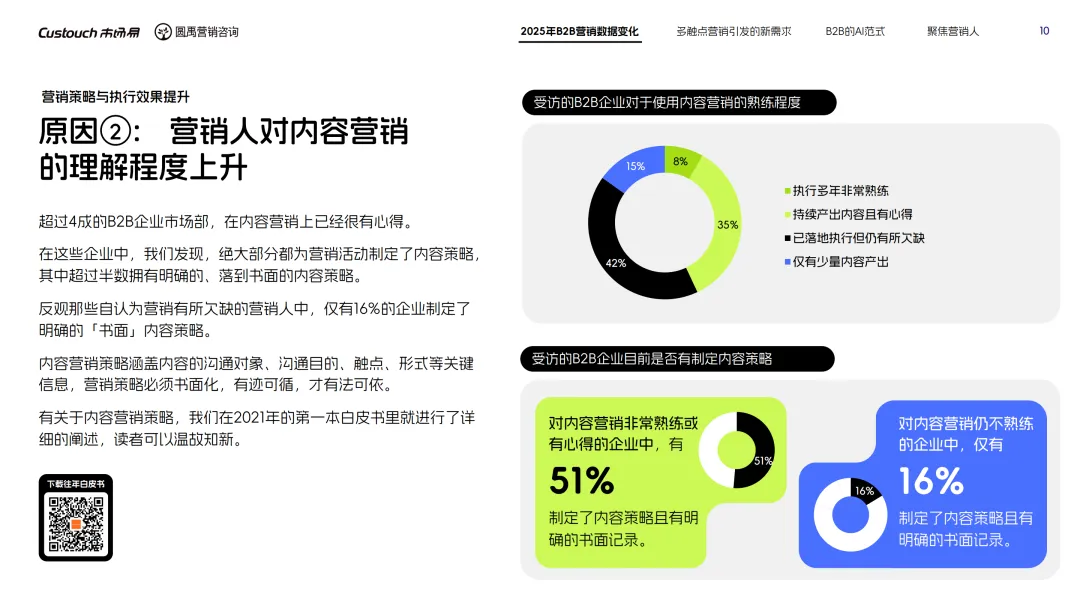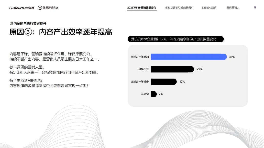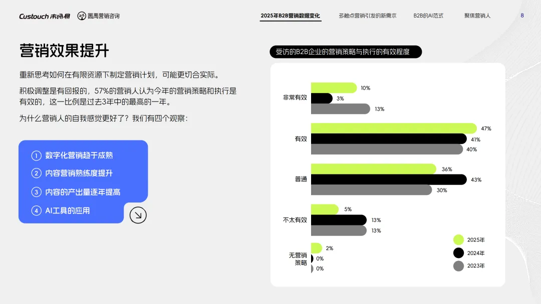 营销效果反而提升:57%的营销人认为2025年策略有效,为三年最高。原因包括: