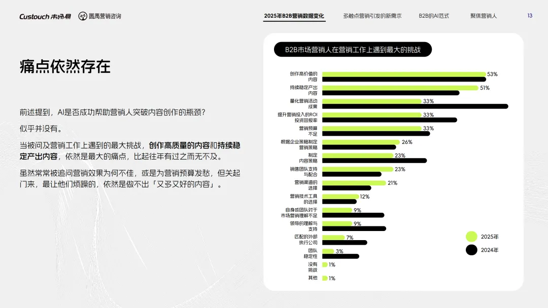 营销人处境:面临“冰火两重天”——市场疲软、预算紧缩,同时亟需通过AI等新技术实现增长。营销部门常被视作“成本中心”,压力巨大。
