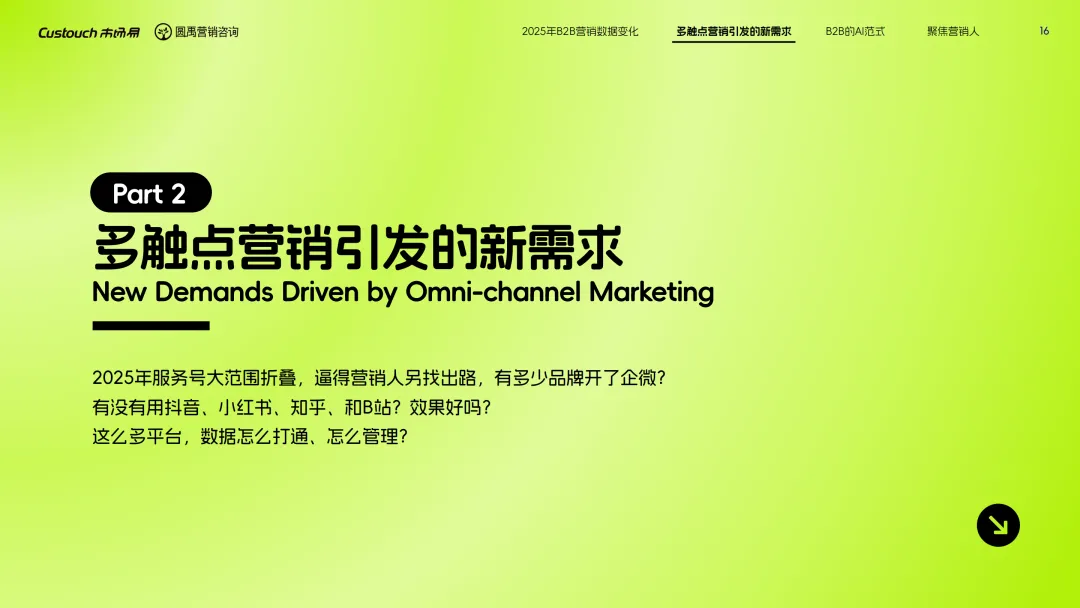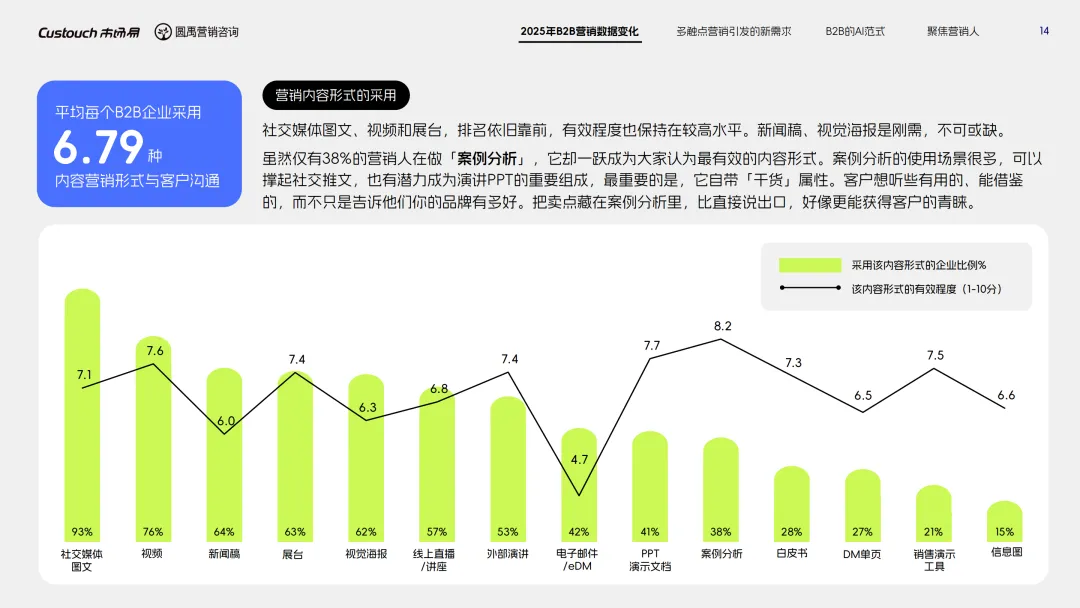 渠道多元化:企业平均使用7.55个营销渠道。微信服务号折叠后,企业微信(30%)、抖音/快手(29%)、小红书(20%)、B站(19%)成为新阵地。