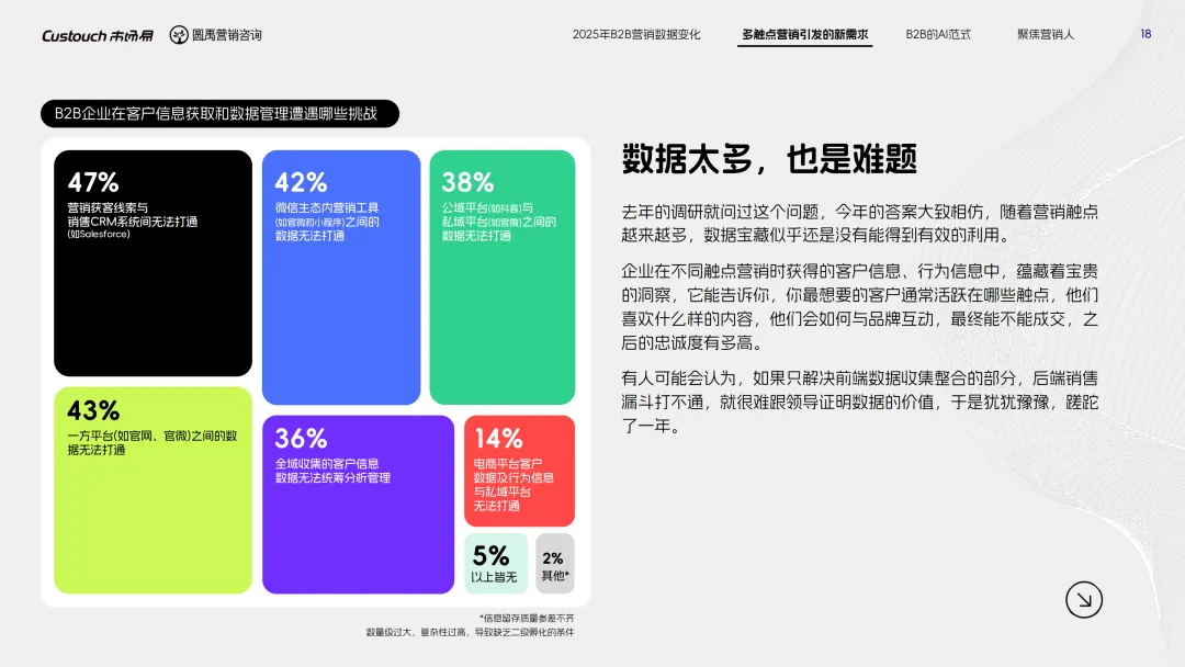 数据孤岛问题突出:47%的企业面临各渠道数据无法打通的困境,导致客户洞察分散、效果评估困难。