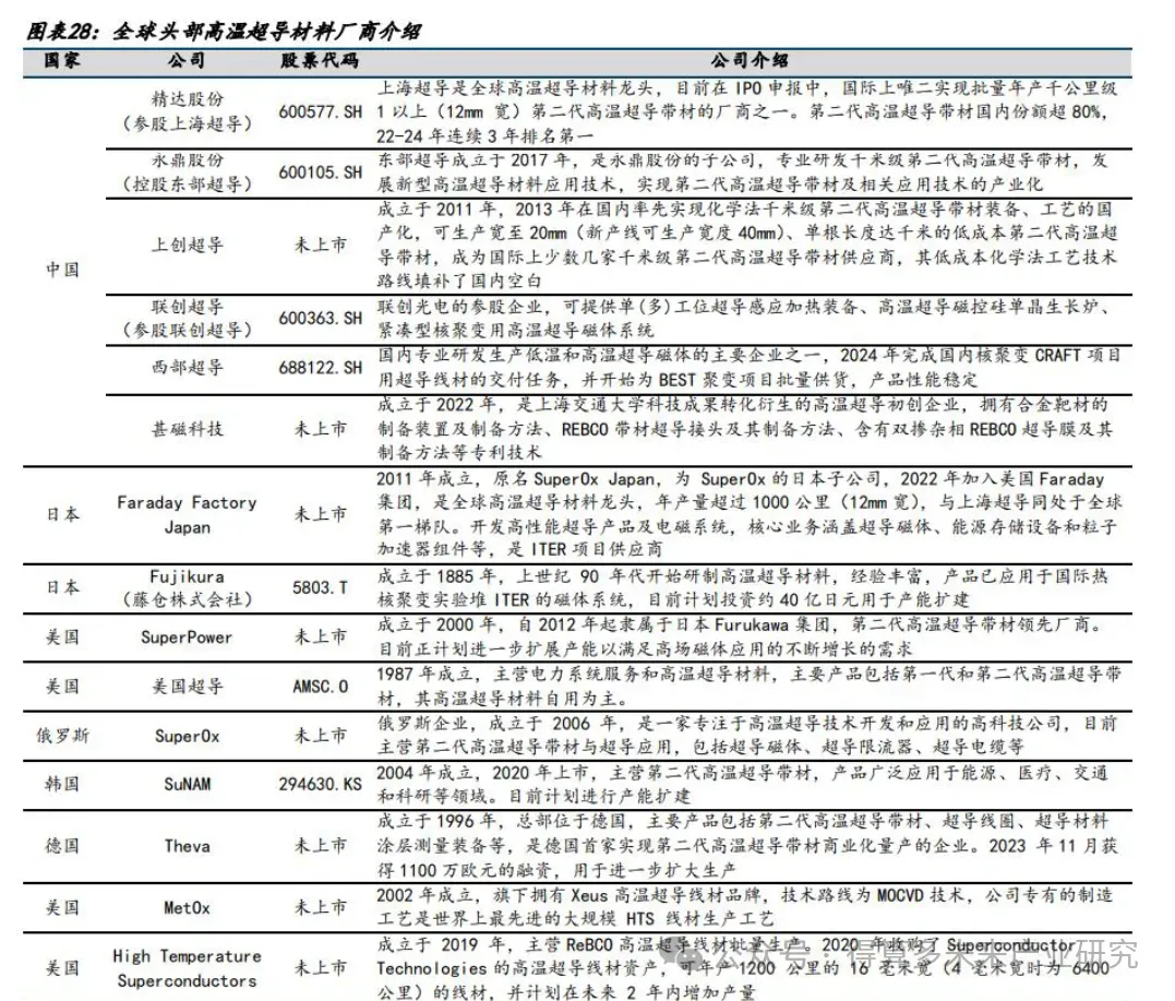 行业集中度高,产能严重紧缺,龙头厂商积极扩产。高温超导材料技术壁垒较高,全球实现量产的企业较少,多数为国外企业,行业集中度较高。根据上海超导招股说明书,以供给能力划分,目前全球厂商可以分为三个梯队:第一梯队为上海超导与FFJ,年产量已超过1000公里(12mm宽);第二梯队包括SuperPower、Fujikura、SuperOx、SuNAM、Theva、美国超导、东部超导和上创超导等,年产量数十至数百公里不等;第三梯队包括MetOx、SupremaTape、High Temperature Superconductors等公司,整体处于研发或样品供给阶段。