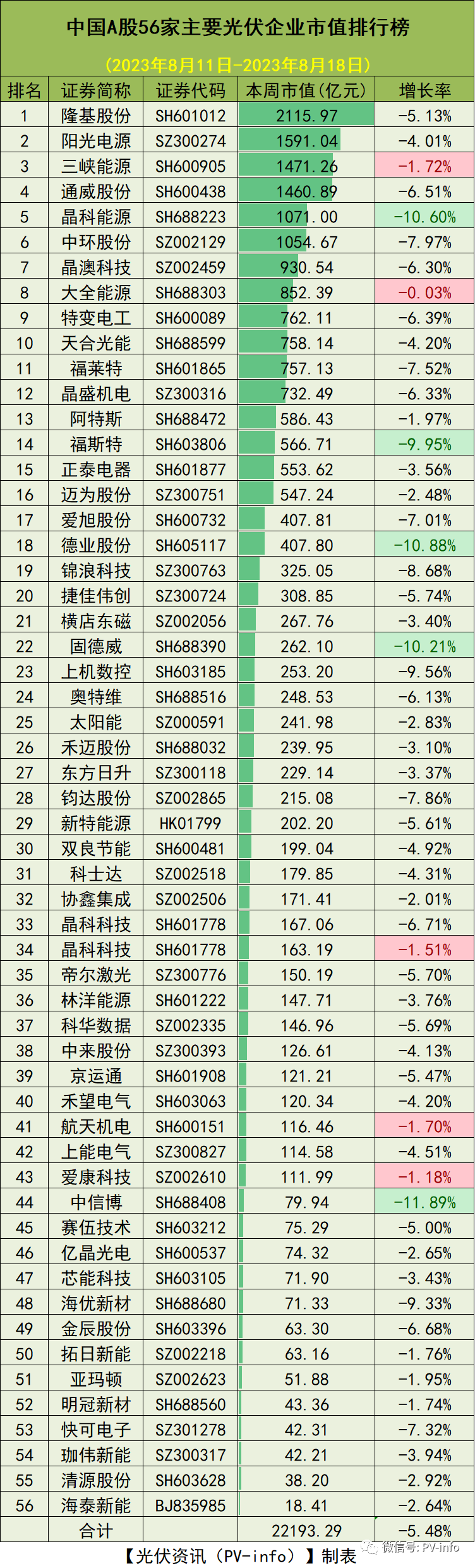 家光伏企业市值总计22193.29亿元,比上周减少1287.75亿元,本周下降5.48%。