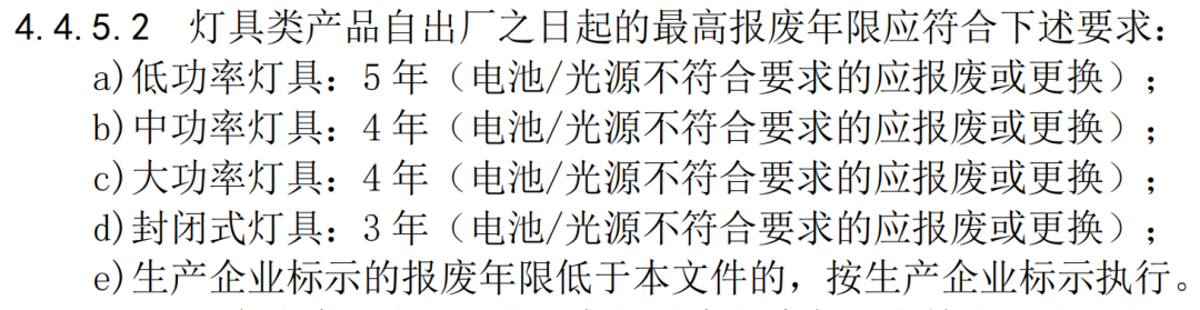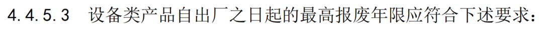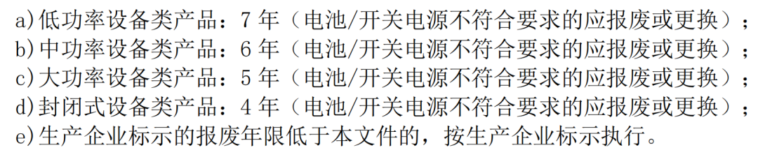 a)低功率设备类产品:7 年(电池/开关电源不符合要求的应报废或更换);b)中功率设备类产品:6 年(电池/开关电源不符合要求的应报废或更换);c)大功率设备类产品:5 年(电池/开关电源不符合要求的应报废或更换);d)封闭式设备类产品:4 年(电池/开关电源不符合要求的应报废或更换);e)生产企业标示的报废年限低于本文件的,按生产企业标示执行。