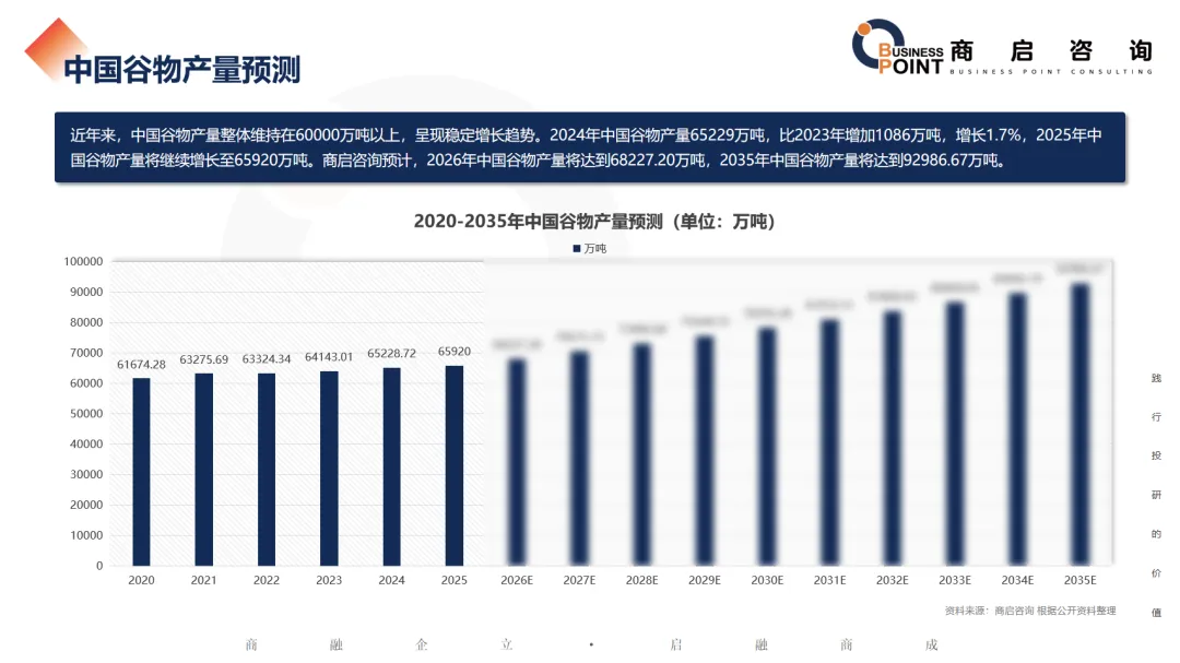 近年来,中国谷物产量整体维持在60000万吨以上,呈现稳定增长趋势。2024年中国谷物产量65229万吨,比2023年增加1086万吨,增长1.7%,2025年中国谷物产量将继续增长至65920万吨。商启咨询预计,2026年中国谷物产量将达到68227.20万吨,2035年中国谷物产量将达到92986.67万吨。