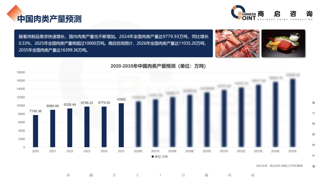 随着肉制品需求快速增长,国内肉类产量也不断增加。2024年全国肉类产量达9779.93万吨,同比增长0.33%,2025年全国肉类产量将超过10000万吨。商启咨询预计,2026年全国肉类产量达11035.20万吨,2035年全国肉类产量达16399.36万吨。