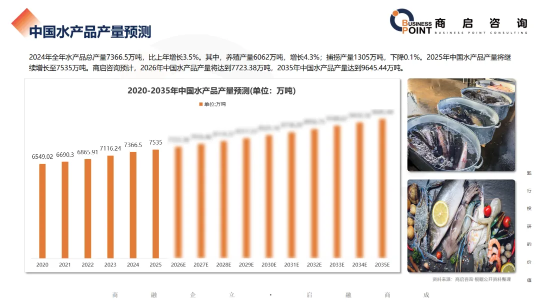 2024年全年水产品总产量7366.5万吨,比上年增长3.5%。其中,养殖产量6062万吨,增长4.3%;捕捞产量1305万吨,下降0.1%。2025年中国水产品产量将继续增长至7535万吨。商启咨询预计,2026年中国水产品产量将达到7723.38万吨,2035年中国水产品产量达到9645.44万吨。