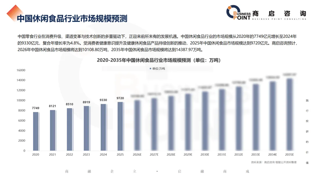 中国零食行业在消费升级、渠道变革与技术创新的多重驱动下,正迎来前所未有的发展机遇。中国休闲食品行业的市场规模从2020年的7749亿元增长至2024年的9330亿元,复合年增长率为4.8%。受消费者健康意识提升及健康休闲食品产品持续创新的推动,2025年中国休闲食品市场规模达到9720亿元。商启咨询预计,2026年中国休闲食品市场规模将达到10108.80万吨,2035年中国休闲食品市场规模将达到14387.97万吨。