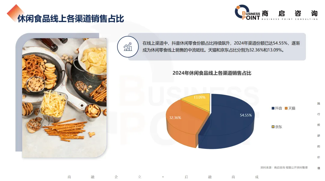 在线上渠道中,抖音休闲零食份额占比持续飙升,2024年渠道份额已达54.55%,逐渐成为休闲零食线上销售的中流砥柱。天猫和京东占比分别为32.36%和13.09%。