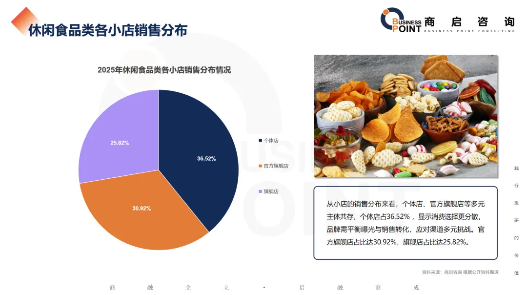 从小店的销售分布来看,个体店、官方旗舰店等多元主体共存,个体店占36.52% ,显示消费选择更分散,品牌需平衡曝光与销售转化,应对渠道多元挑战。官方旗舰店占比达30.92%,旗舰店占比达25.82%。