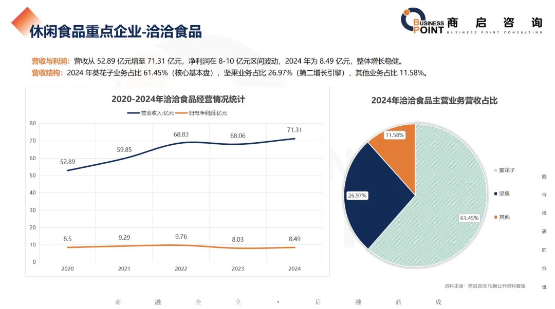 营收结构:2024 年葵花子业务占比 61.45%(核心基本盘),坚果业务占比 26.97%(第二增长引擎),其他业务占比 11.58%。
