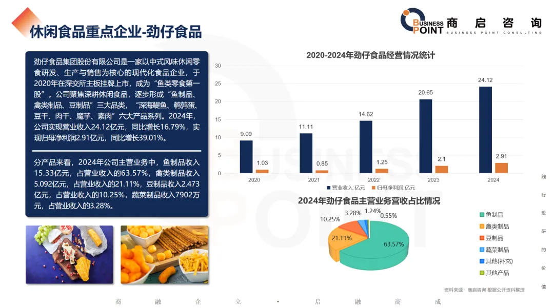 劲仔食品集团股份有限公司是一家以中式风味休闲零食研发、生产与销售为核心的现代化食品企业,于2020年在深交所主板挂牌上市,成为“鱼类零食第一股”。公司聚焦深耕休闲食品,逐步形成“鱼制品、禽类制品、豆制品”三大品类,“深海鳀鱼、鹌鹑蛋、豆干、肉干、魔芋、素肉”六大产品系列。2024年,公司实现营业收入24.12亿元,同比增长16.79%,实现归母净利润2.91亿元,同比增长39.01%。