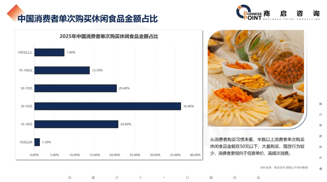 中国消费者单次购买休闲食品金额占比
