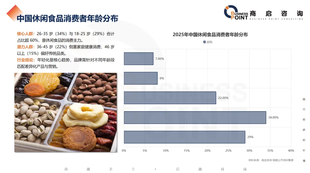 核心人群:26-35 岁(34%)与 18-25 岁(29%)合计占比超 60%,是休闲食品的消费主力。