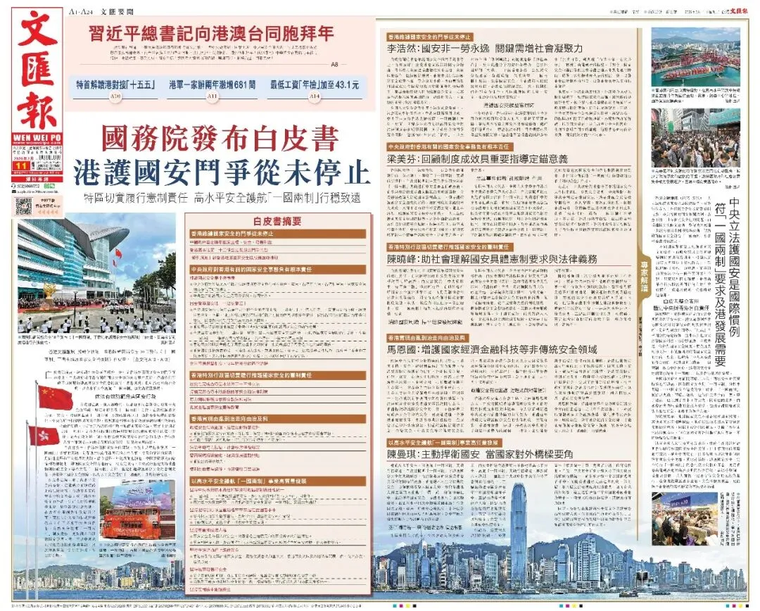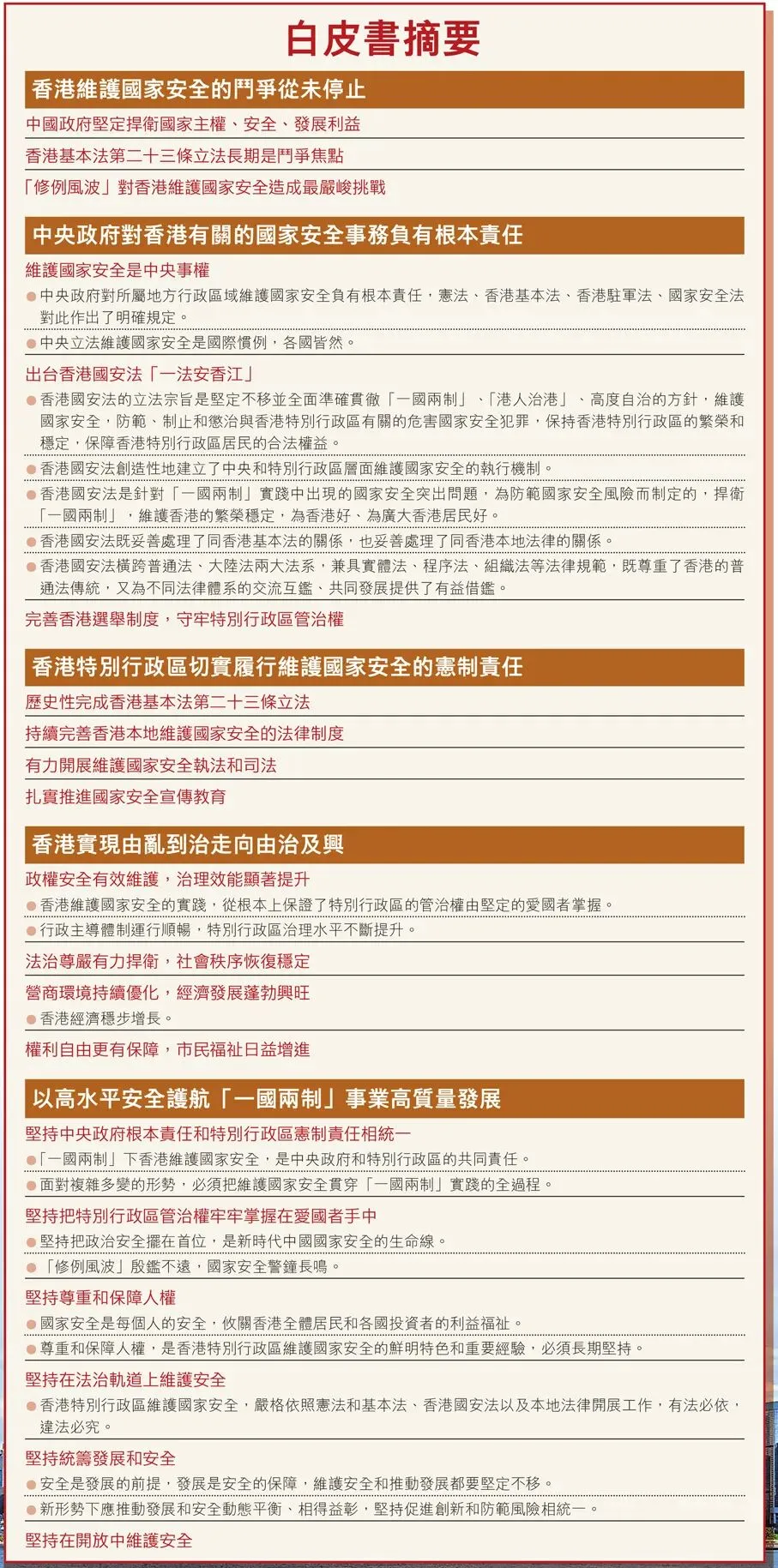白皮書強調,進入新時代,以習近平同志為核心的黨中央全面準確、堅定不移貫徹「一國兩制」方針,強調維護國家主權、安全、發展利益是「一國兩制」方針的最高原則。面對香港局勢動盪變化,中央政府堅持總體國家安全觀,依照憲法和基本法有效實施對特別行政區的全面管治權,制定實施香港特別行政區維護國家安全法,落實「愛國者治港」原則,支持香港特別行政區切實履行維護國家安全的憲制責任,依法有效防範、制止和懲治危害國家安全的行為和活動,香港進入從由亂到治走向由治及興的新階段,展現出光明前景。