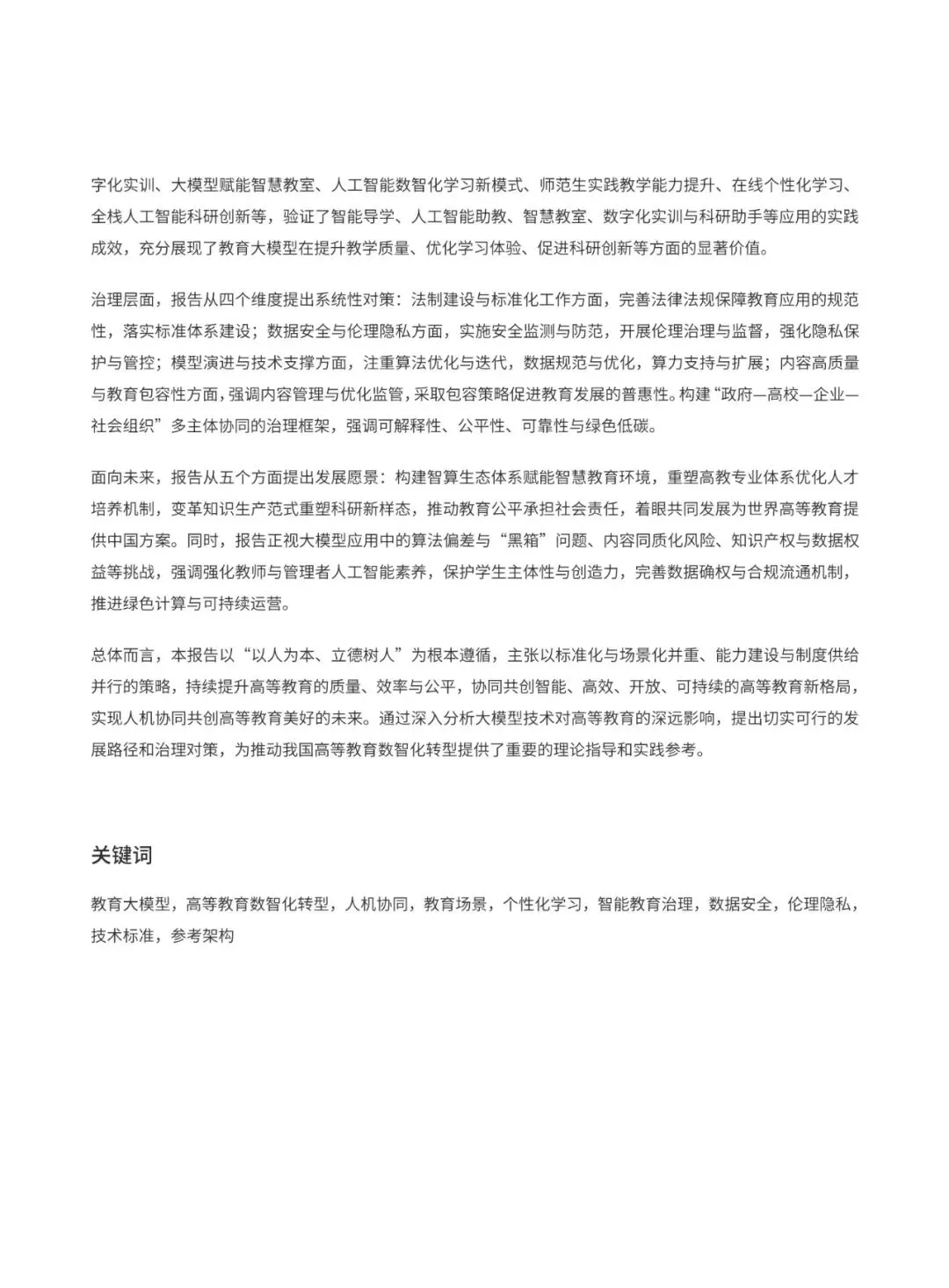 报告从技术、社会与教育三个维度深入审视机遇与挑战:在技术层面,算力、数据与算法的突破孕育创新红利,但面临安全、伦理、偏差与治理等现实约束;在社会层面,发展契机与潜在风险并存;在教育层面,知识去中心化、学习个性化的进程中,需要同步重塑价值导向与能力结构。基于深入分析,报告提出推动高等教育走向智能、高效、开放、可持续发展的总体目标,涵盖升级智慧教育环境建设、创新人才培养模式、促进跨学科和人机协同科研、提升社会服务能力、加强国际交流合作、助力文化传承传播、建构数据驱动的教育治理体系等七个重要方面。报告的核心关切聚焦于如何在拥抱人工智能技术创新的同时,建立有效的治理机制,并确保高等教育的人文价值和社会责任得到维护。