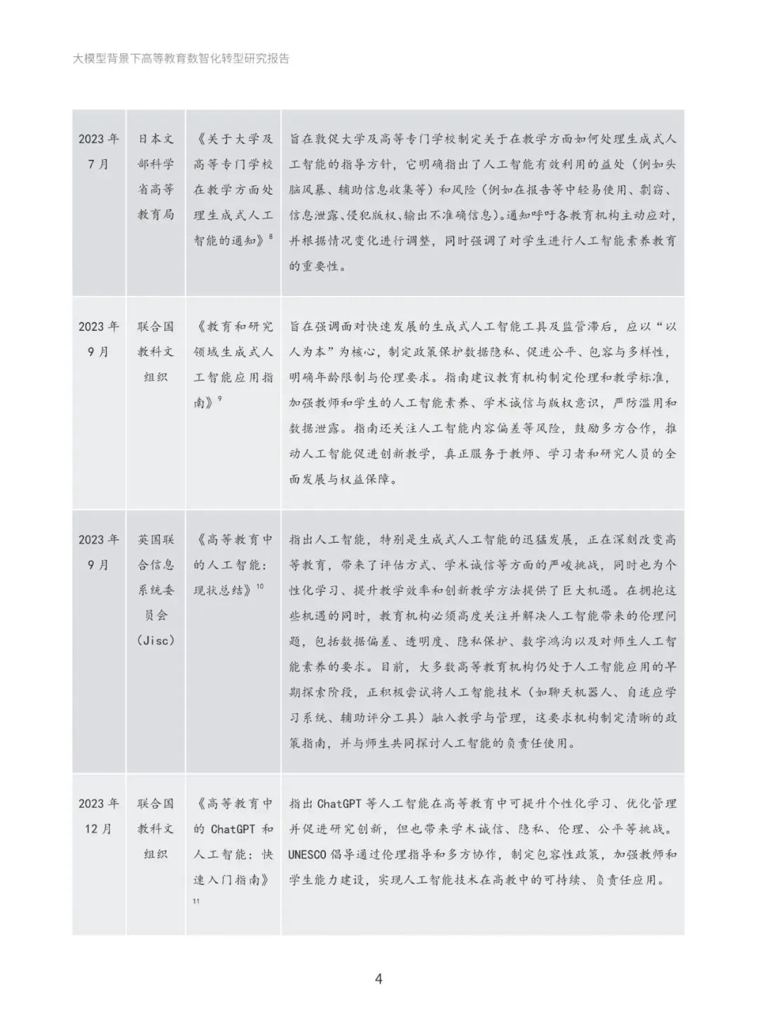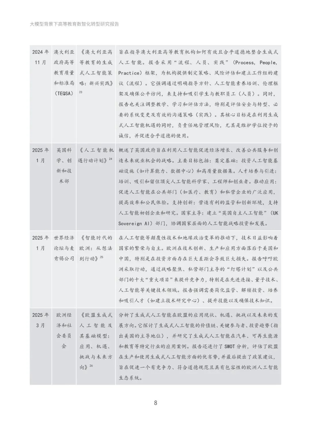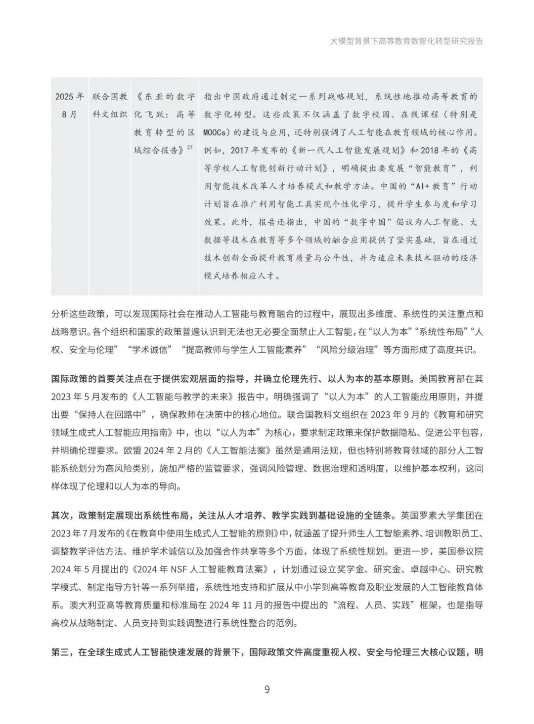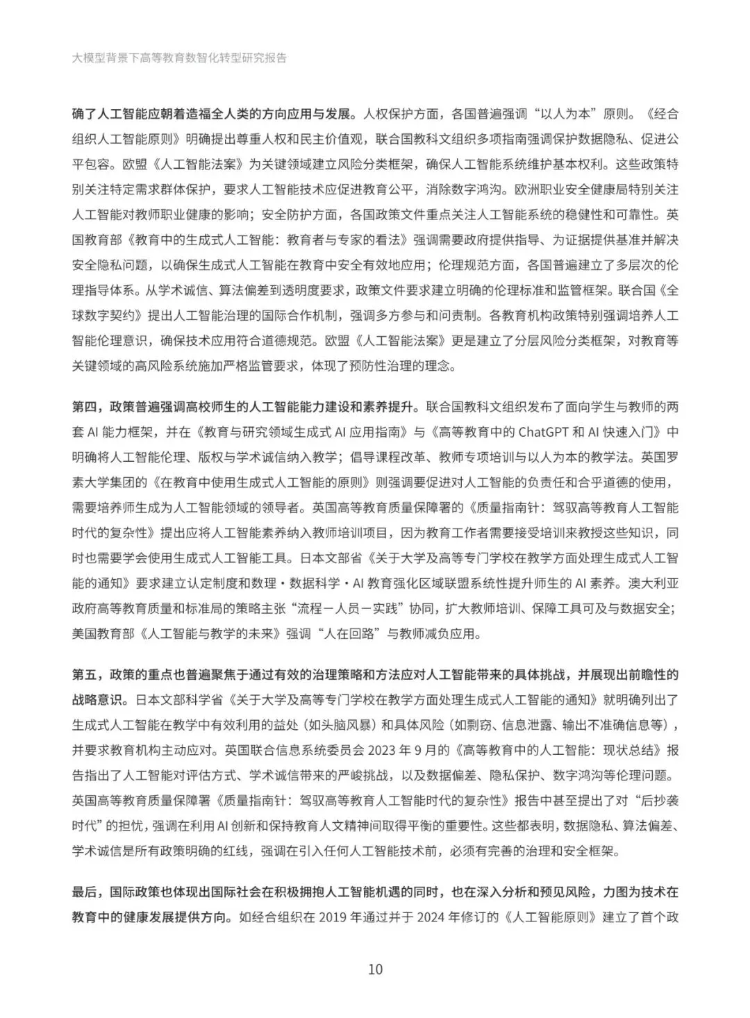 本报告系统梳理国际与国内政策进展,深入分析国际社会高度重视人工智能教育应用的政策动向,以及国内以人工智能为基础推动教育创新发展的政策布局。通过政策梳理与分析,提炼出“人才培养、科学研究、社会服务与国际合作”四大导向,明确高等教育数智化转型的发展方向和战略目标。