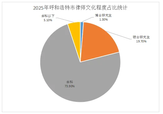 2025年,呼和浩特市律师队伍文化程度整体呈现“本科为基、高学历稳步提升”的特点。高学历群体合计占比21%,为行业在高端商事、涉外法律、知识产权等复杂专业领域的突破提供了智力支撑。下一步,行业将重点推进律师继续教育体系建设,引导律师向复合型、高学历方向发展。