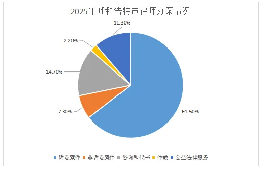 2025年,呼和浩特市律师办理各类法律事务47893件,其中诉讼案件30908件,占比64.5%;非诉讼案件3505件,占比7.3%;咨询和代书7039,占比14.7%;仲裁业务1047件,占比2.2%;公益法律服务5394件,占比11.3%;在1977家党政机关、人民团体和企事业单位担任法律顾问。