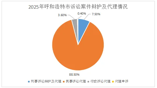 2025年,呼和浩特市律师共办理各类诉讼案件30908件,其中刑事诉讼辩护及代理2310件,占诉讼案件7.5%;民事诉讼代理件27349,占诉讼案件88.5%;行政诉讼代理1124件,占诉讼案件3.6%;代理申诉125件,占诉讼案件0.4%。