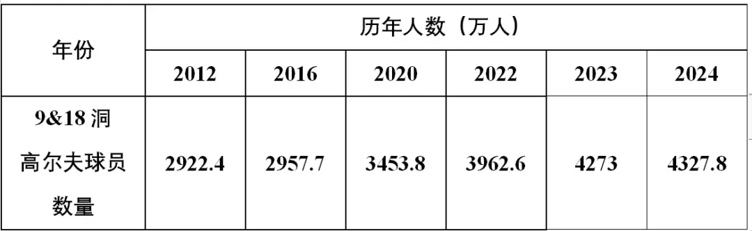 在高尔夫球员数量方面,全球9洞和18洞高尔夫球员数量在过去十年持续增长,呈现出稳步上升的良好趋势。2012年全球标准球手数量为2922万人,到2016年略微上升至2957万人,增长相对缓慢。但自2020年起,这一数字出现显著跃升,达到3453万人,2024年更进一步增长至4327.8万人,十二年间增长超过1400万人,增幅约48%。